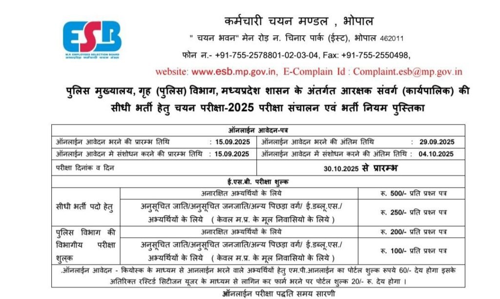 MP Police Constable Bharti: मध्य प्रदेश कर्मचारी चयन बोर्ड एमपीईएसबी द्वारा मध्य प्रदेश पुलिस कांस्टेबल के विभिन्न पदों पर भारती का नोटिफिकेशन जारी किया गया है यह भारती का नोटिफिकेशन 7500 पदों के लिए जारी किया गया है इसके लिए आप 15 सितंबर से लेकर 6 अक्टूबर 2025 तक आवेदन कर सकते हैं इसके बारे में नीचे विस्तार से बताया गया है। इस भर्ती के लिए इच्छुक विद्यार्थी इस पूरी पोस्ट को पढ़ने के बाद जरूर आवेदन करें।
